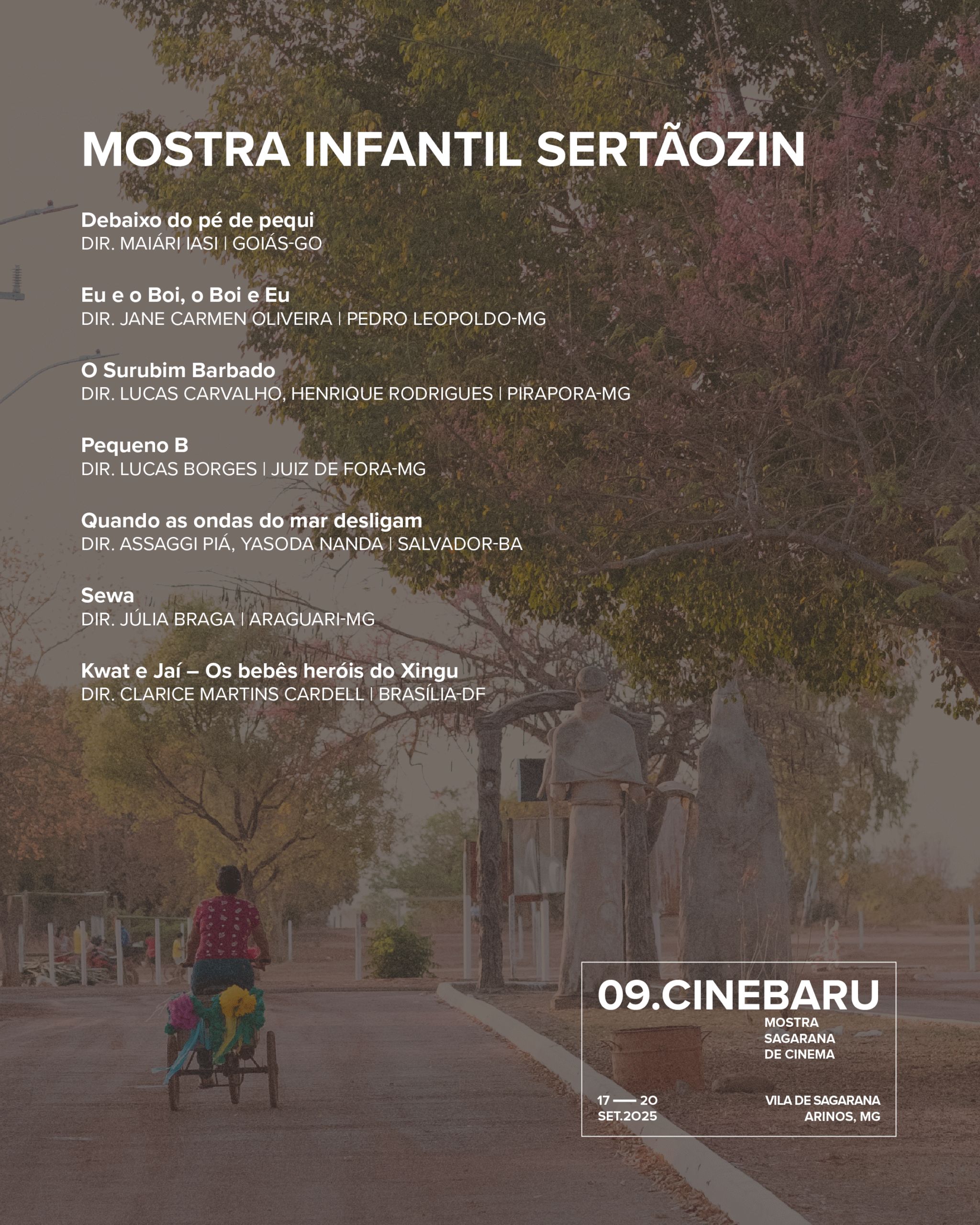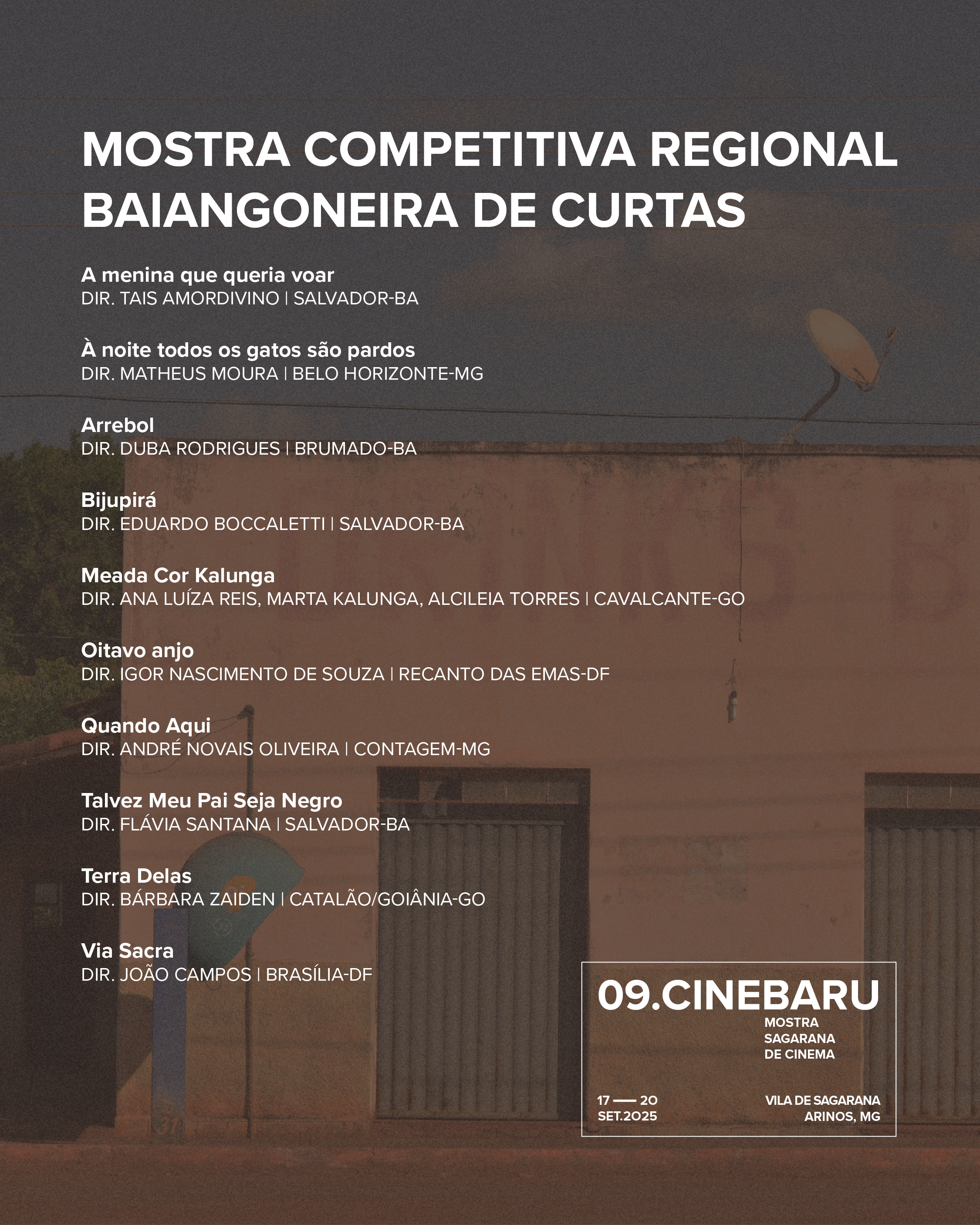 As obras escolhidas integram a Mostra Competitiva Regional Baiangoneira de Curtas, a Mostra Infantil Sertãozin e a Mostra Sertão. Filmes que brotam de territórios férteis em criação, vindos da Bahia, Goiás, Minas Gerais e Distrito Federal.
